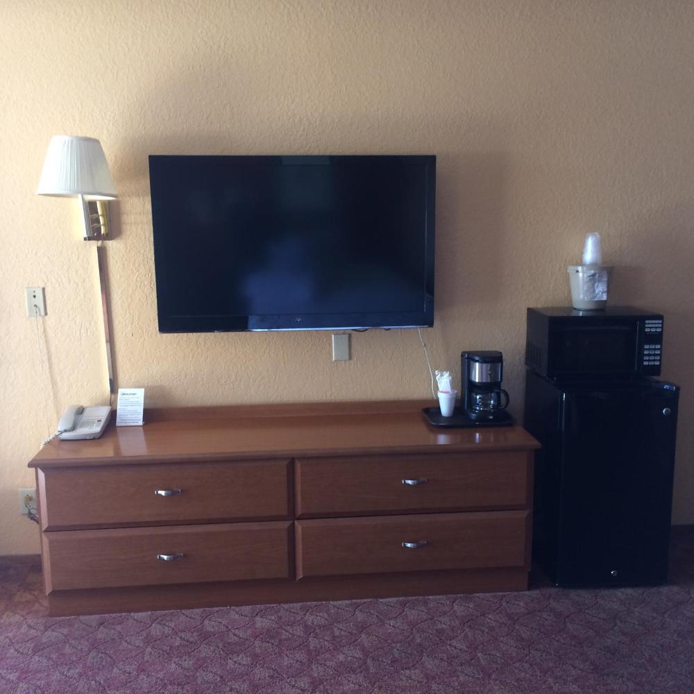 A cable TV, a microwave, and a refrigerator are provided in this room.